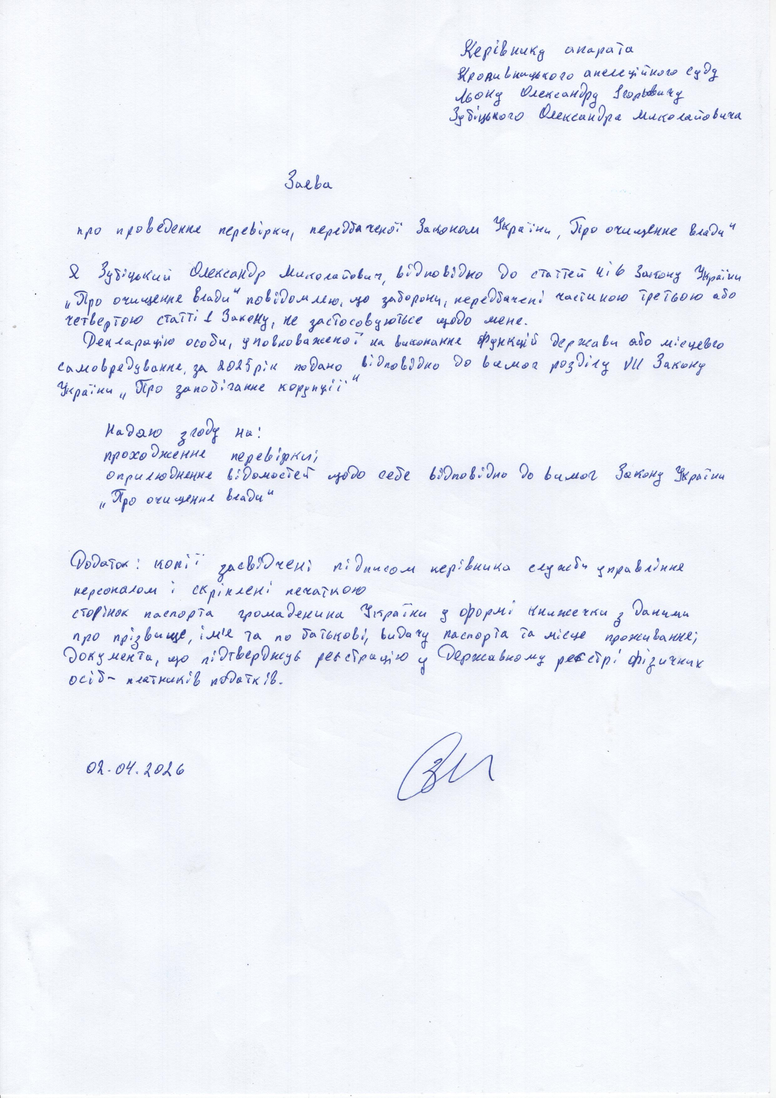 У Кропивницькому апеляційному суді 02 квітня 2026 року розпочато проведення перевірки відповідно до Закону України "Про очищення влади" стосовно Зубіцького Олександра Миколайовича, як кандидата на посаду завідувача сектору з питань інформаційних технологій та технічного захисту Кропивницького апеляційного суду(заява, декларація).