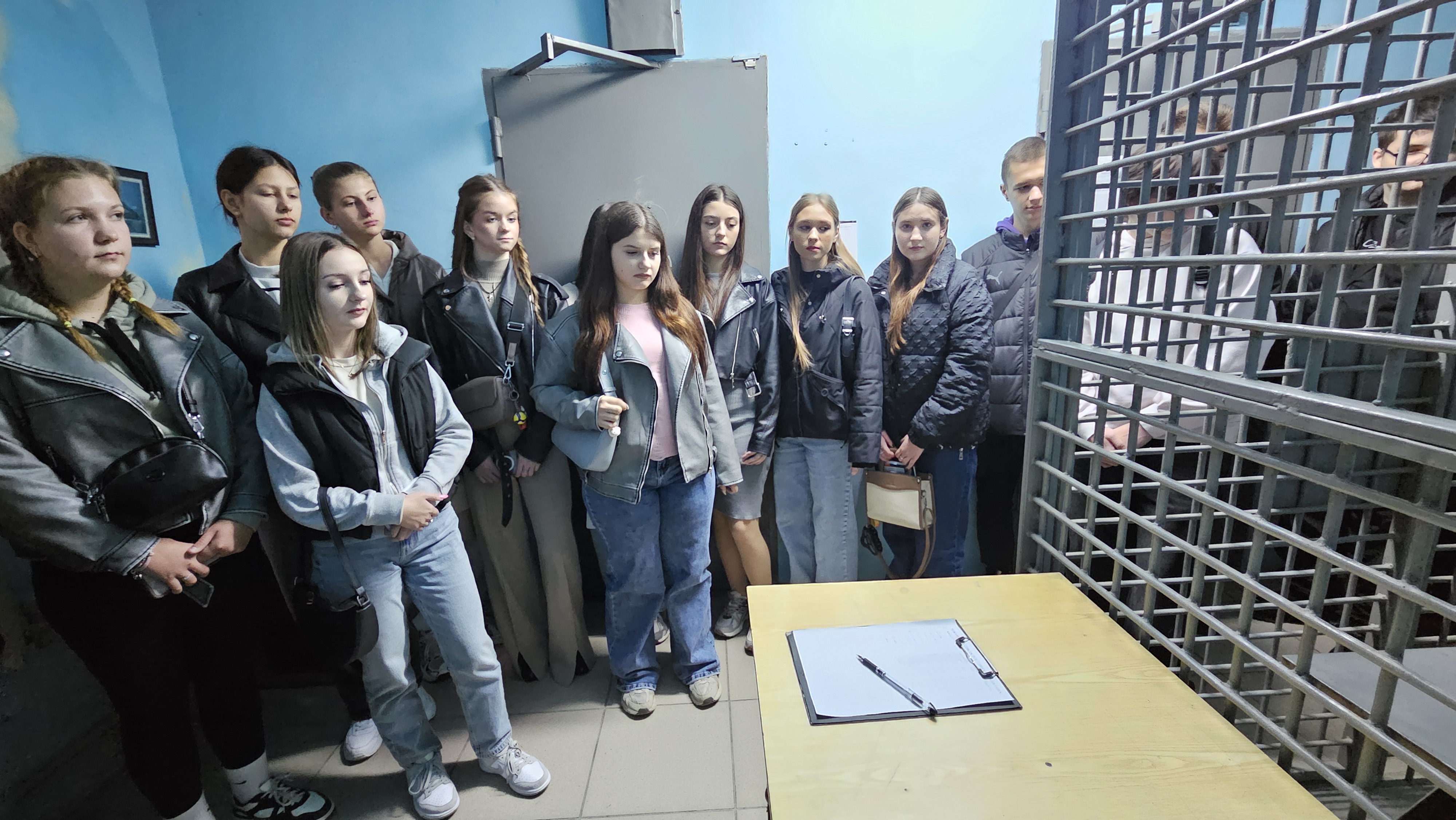 Старший судовий розпорядник Віталій Московенко, детально ознайомив та продемонстрував студентам спеціальне приміщення, що призначене для тимчасового утримання осіб, взятих під варту або засуджених, до та під час судового засідання.